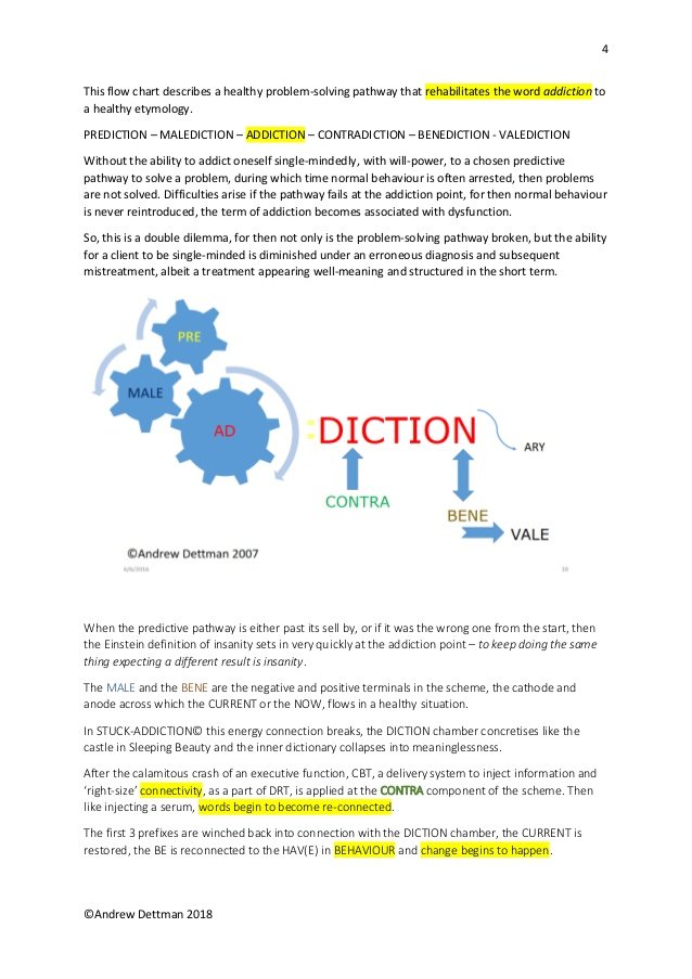 Addiction itself is a necessary and healthy component of ordinary problem solving. This simple though startling statement for some, is shown clearly on the flow chart that is on every page of this site. The word ‘addiction’ simply means the ability to apply oneself in a single-minded manner to a chosen predictive problem solving pathway with willpower, during which time usual behaviour can become temporarily arrested. Upon the resolution of the problem, usual behaviour patterns are reinstituted. (www.drt.global/corporate)